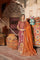 A zardozi embellished printed shirt paired with a contrasting burnt orange net dupatta adorned with printed borders all around and a complementing trouser.