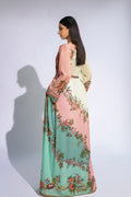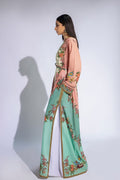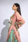 A classic combination of teal green with tea pink in a full length kaftan, the colors being separated by a beautiful chain of flowers. Pair it with pants.