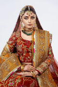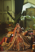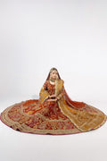 Ignite your wedding day with the radiant glow of this orange bridal ensemble. A jacquard-woven choli boasts intricate zardozi embroidery with shimmering naqshi, dabka, resham, crystals, and sequins, while the lehenga echoes the floral motif with a matching jacquard weave. A tissue-embellished belt with zardozi work cinches your waist, and a four-inch zardozi border adds captivating drama to the hem. A delicately embroidered net dupatta completes the look, while a secondary shawl woven in floral jacquard and adorned with heavy zardozi embroidery amplifies the opulent vibe.
