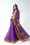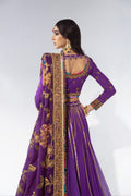 Embrace the mystique of twilight with this ethereal purple chiffon bridal ensemble. A whisper-light choli shimmers with delicate zardozi booti embroidery, as if stardust were dusted across your form. Exquisite borders grace your wrists and neckline, front and back, mirroring the stardust with their intricate zardozi work. The chiffon flows seamlessly into a captivating lehenga of 56 panels, each a mere 10 inches wide, joined by shimmering golden gotta that catches the light like moonlight on waves. At the hem, a flourish of floral zardozi blooms in amethyst hues, adding a touch of fairytale enchantment. The final note of luxury comes in the form of a jacquard floral dupatta, where intricate zardozi embroidery featuring naqshi, dabka, crystals, and resham dances under the light. Multi-colored taffeta adorns the edges, adding a vibrant whisper of contrast.