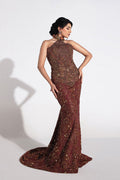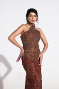 Color: Wine Product Description: Net based, choker neckline with body fitted gown. The top is entirely hand embellished and the rest is covered with sequin florals with 3D hand work detailing. It is accessorized with organza fabric draped around it. Shipping Time: 2-3 months Color of this outfit may slightly vary due to photographic lighting sources or your monitor settings. Note: Please mention your height in special instructions before checking out.