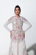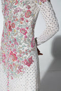 Color: White Product Description: Crew neck, front open. full sleeve, full length gown with sequin filled, white net base fabric. It is covered with floral motives on front and both sides on bottom. These motives are fully hand embellished. Similar but smaller floral motives are patched on the shoulder. Its hemline is covered with slim floral border. It is accessorized with a similar floral belt Shipping Time: 2-3 months Color of this outfit may slightly vary due to photographic lighting sources or your monitor settings. Note: Please mention your height in special instructions before checking out.
