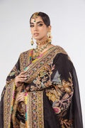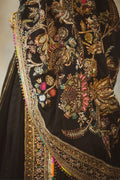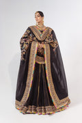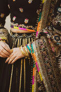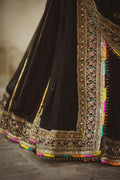 Embrace the timeless allure of black and gold in this exquisite bridal ensemble. A black chiffon choli shimmers with delicate zardozi booti embroidery, accented by intricate borders on the wrists and neckline. The choli's elegance extends to the back, where the zardozi work continues to captivate. The flowing chiffon lehenga, composed of 56 panels artfully joined with golden gotta, creates a mesmerizing silhouette. A flourish of floral zardozi work graces the lehenga's border, adding a touch of captivating charm. The ensemble is complete with a jacquard floral dupatta, where zardozi embroidery featuring naqshi, dabka, crystals, and resham takes center stage. The dupatta's exquisite beauty is further enhanced by a multi-colored taffeta, adding a vibrant finishing touch. This stunning creation is a masterpiece of tradition and modernity.