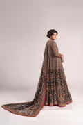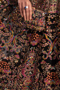 Redefine modern bridal elegance with this striking black ensemble. The net pishwas features a unique open jacket style, adorned with a captivating combination of resham embroidery and shimmering sequins. The intricate details are further elevated by zardozi embellishments, adding a touch of timeless sophistication. Paired with luxurious Korean silk Azar pants featuring an embellished border finish, this outfit offers a contemporary twist on traditional silhouettes.