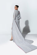 Color: Silver Product Description: It is a full sleeve, crew neck, full length gown with silver net sequin jaal base. This gown has a unique feature of a cape draped from front going from over the shoulder all the way to the back. This cape is lined with bright cherry color used as a complimentary color. The front is embellished with hand work motive and multicolor thread work. A similar smaller floral motive is patched on the cape shoulder bringing about a cohesive look. Shipping Time: 2-3 months Color of this outfit may slightly vary due to photographic lighting sources or your monitor settings. Note: Please mention your height in special instructions before checking out.