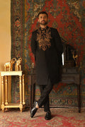 Attractive black color self-silk jamawar sherwani paired with same fabric pants, beautifully finished with zardozi neckline on front.