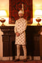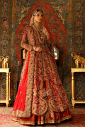 A red colored dress made on pure silk which includes an intricate resham work on jacket with zardozi work and resham motifs on back paired with heavily embellished four sided bordered on dupattas, a net veil with resham and zardozi work on borders and jamawar lehenga finished with zardozi borders.