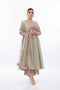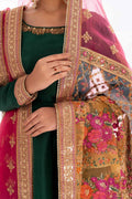 This exquisite silk anarkali shirt features intricate zardozi work on the neckline and shoulder motifs, exuding elegance and grace. Paired with silk plain bottle green bootcut pants, this ensemble is a true epitome of sophistication. The organza embroidered dupatta, adorned with an antique tissue embroidered border, adds a touch of opulence to the overall look.