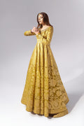 Transform into a queen of gilded splendor with this majestic 14-panel pishwas. Shimmering floral jacquard dances in the light, each panel adorned with cascading zardozi embellishments that kiss the bodice and sleeves. Luxurious golden velvet graces the neckline, front and back, adding a touch of regal elegance. Flared pk silk pants whisper with a jacquard border at the hem, while a golden floral jacquard dupatta woven with shimmering zari drapes like a whispered promise of forever. This ensemble is a symphony of sunlit splendor, ready to paint your wedding day in unforgettable hues of gold.
