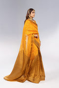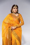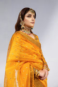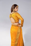 Make a statement of sophisticated elegance with our formal wedding saree ensemble. Crafted from luxurious jacquard weave in a captivating mango hue, the blouse is adorned with exquisite Zardozi work intricately embellishing the neckline, front, back, and wrist, complemented by a delicate sequin spray for added glamour. The ensemble is perfectly paired with a jacquard organza saree, exuding grace and poise. Finished with a flared petticoat, this saree ensemble is an embodiment of refined beauty, ideal for formal wedding occasions where every detail counts.