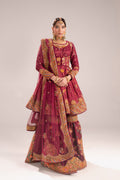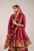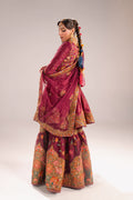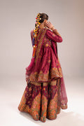 This four-piece traditional outfit is a rich deep berry or wine-colored fabric. The style is a modern iteration of a gharara suit.The ensemble features a short, flaired peplum with a fitted bodice and bolero on top with matching dupputa. Main fabric is net but lined with tissue to increase it grandeur Both the peplum and the voluminous gharara are heavily adorned hemline and the gharara's tiers are intricately decorated with wide borders of detailed incorporating touches of teal, orange, and green embroidery.The overall aesthetic is opulent and traditional, suitable for formal celebration like a wedding or shaadi.
