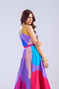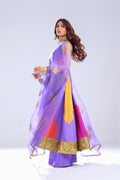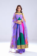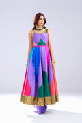 An anarkali dress featuring a rich purple base adorned with an array of colorful patches. The dress showcases a classic Anarkali silhouette with a dramatically flared hem, embellished with intricate gota work for a touch of opulence. The deep neckline is beautifully decorated with intricate embellishments.