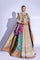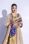 Embroidered chikankari anarkali shirt with antique zardozi work on neckline and gotta spray on panels and pk silk pants with embroidered border and multi-color landscape patchwork on Indian silk finished with antique embroidered border.