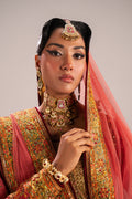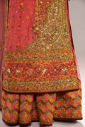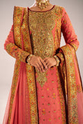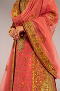 This luxurious and heavily embellished three-piece ensemble, primarily in a beautiful dusty rose. The outfit consists of a long, straight- cut Kurta paired with voluminous Gharara. The long shirt features a densely embroidered gold zardozi and intricate embellishment across the body, often incorporating shimmering sequins and gold thread work in a scattered pattern. The gharara has wide, ornate borders with gold embroidery and small accents of green or maroon, complementing the overall richness. A sheer matching net dupatta frames the outfit beautifully. It features a stunningly wide and detailed gold border along all edges. The overall aesthetic is one of traditional elegance and opulence, perfect for a wedding celebration.