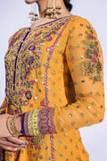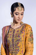 Embroidered short paneled shirt with zardozi work on front mid panels and sleeves paired with net embroidered gharara with borders and net dupatta finished with embroidered border velvet.