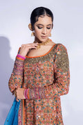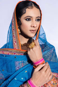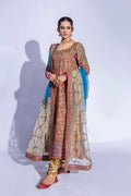 Embroidered long shirt antique zardozi work on neckline, hem, and wrist, and sleeves motifs paired with Korean raw silk churidar and organza mukesh embroidered dupatta finished with embroidered border, velvet, and lace.