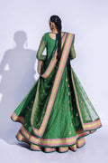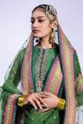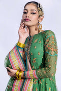 Embroidered drape shirt with zardozi and crystal work on shirt front panels, neckline, and sleeves paired with embroidered net gharara and embroidered net dupatta finished with velvet.
