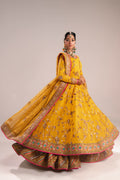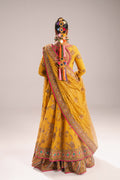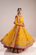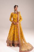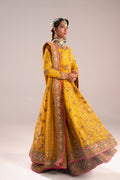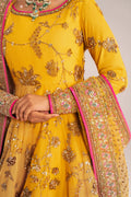 This regal full length Anarkali style gown is a luminous mustard yellow. The entire outfit is heavily embellished with fine embroidery and shimmering sequin work in a scattered floral pattern.The most striking feature is the use of contrasting borders on the hem of the gharara pants and the matching sheer dupatta are richly decorated with intricate embroidery work .The overall ensemble is opulent and designed for a major formal event, such as a mehndi or wedding celebration.