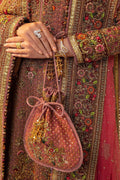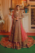 A mesmerizing Kundan zari dull pink long shirt, adorned with intricate handwork of reshma, zardozi, crystal, diamotifs, and apleak work. Paired with a stunning jamawar dull pink tail gharara, featuring a flair and border embellished with resham mirror zardozi. Completing the ensemble is a net dupatta in dull pink, with a four-side border showcasing apleak work, resham work, zardozi details, and finished with delicate metal and crystal accents. And let's not forget the elegant shawl in rust and pink mukesh fabric, adorned with mukesh gotta and mirror work, adding a touch of grace and sophistication.
