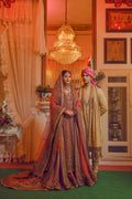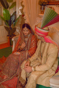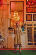 A regal sherwani in embossed silk, elegantly crafted in an ivory color. The ban and sleeves are adorned with intricate zardozi and crystal work, adding a touch of opulence and grandeur. Complementing the sherwani is a patka, also in embossed silk ivory, featuring a border embellished with resham and zardozi work, along with delicate tilla tussles for added charm. Pairing perfectly with the ensemble are churidar pants made of Korean silk, ensuring a comfortable and stylish fit. Completing the outfit is an inner shirt in Korean silk, providing a smooth and luxurious base layer.