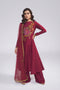 Behold, a sartorial masterpiece draped in the opulence of bottle green silk. This exquisite shirt boasts a captivating symphony of six panels adorning both the front and back, culminating in a breathtaking five-yard flare that cascades elegantly. Intricate zardozi embroidery graces the neckline and bicep motifs, whispering tales of ancient artistry. Accompanying this regal ensemble is a pair of pure silk Culottes, their embroidered bottoms hinting at whispers of movement beneath. And to crown this symphony of luxury, a diaphanous net dupatta, richly embroidered and adorned with a captivating border, flutters with the promise of untold stories. This is not merely an attire; it is an embodiment of grandeur, a whispered promise of luxury, fit for the most discerning connoisseur.