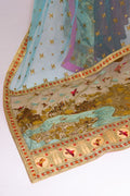 This opulent crimson color anarkali showcases a lavishly adorned neckline and intricate wrist border embroidery. It is expertly paired with graceful bell-bottom pants and an exquisitely embroidered shawl featuring captivating scenes of nature, including birds and stunning landscapes. This ensemble epitomizes luxury and extravagance in every detail.