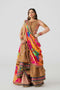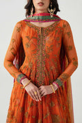 A vibrant, long-sleeved orange dress embellished with intricate embroidery on net with under dress in printed lawn. The dress has a flowing, Anarkali silhouette. Paired with silk printed dupatta featuring a complex paisley pattern in shades of green, pink, yellow, and blue, with embroidered and banarsi borders. The bottoms are in plain lawn finished with banarsi border perfect for festive occasions.