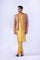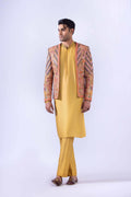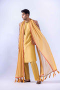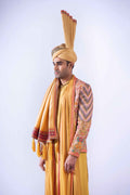Indian raw silk tribal multi-embroidered raja coat finished with embroidered border paired with Korean raw silk kurta with antique zardozi work on neckline and handmade custom buttons and Korean raw silk pants and chiffon patka with all over the embroidered border and handmade tussles and accessorized with embroidered turban with zardozi work finishing.