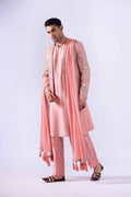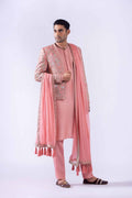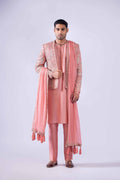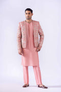 Indian raw silk floral multi-embroidered raja coat finished with embroidered border paired with Korean raw silk kurta with antique zardozi work on neckline and handmade custom buttons and Korean raw silk pants and chiffon patka with all-over embroidered border and handmade tussles and accessorized with embroidered turban with zardozi work finishing.