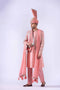 Indian raw silk tribal multi-embroidered raja coat finished with pink velvet and embroidered border paired with Korean raw silk kurta with antique zardozi work on neckline and handmade custom buttons and Korean raw silk pants and chiffon patka with all over the embroidered border and handmade tussles and accessorized with embroidered turban with zardozi work finishing.