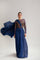 Embellished sequin bodice with asymmetrical top and bottom. This sequin design is paced on a net top and attached to navy blue raw silk drape and sash going around for further styling. Full net sleeves with embellished sequin patched around it. Paired with raw silk pants.