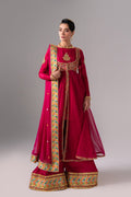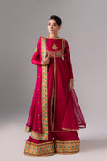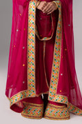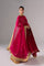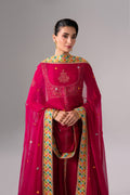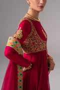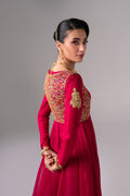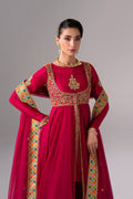 Flowing anarkali-style three-piece suit in rich magenta raw silk, adorned with intricate gold embellishment and an embroidered layered jacket with pure chiffon flared panels for a regal look. Coordinating cuff embroidery, a pure chiffon dupatta with a colorful border, and wide-leg trousers finished with a heavily embroidered hem complete this festive ensemble—perfect for weddings and special occasions.