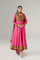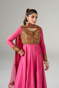 This exquisite pink Anarkali ensemble, crafted from luxurious pure silk and delicate pure chiffon, features a graceful five-paneled flare that spans 5 yards, creating a fluid and flattering silhouette. The standout piece is the intricately embellished over-jacket, adorned with vibrant multicolored sequins and detailed zardozi embroidery, adding depth and a regal touch. The flared pants, complementing the jacket’s intricate border, enhance the cohesive and refined look. A pure chiffon dupatta, delicately embroidered with shimmering accents, drapes effortlessly, adding an ethereal touch to the outfit. Perfect for festive occasions or formal celebrations, this ensemble beautifully blends tradition, luxury, and contemporary elegance.