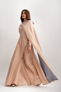 Full length pink raw silk dress with cut on the side from waist.Raw silk cape draped around the neck line with grey lining popping out as a complimentary color.Motive on one shoulder going down and enhancing the silhouette.Paired with raw silk pants.