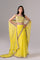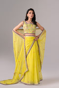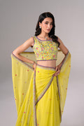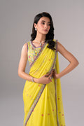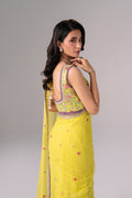 Vibrant lime yellow pure chiffon saree featuring an intricately embroidered border for a subtle sparkle and elegant finish. Paired with a raw silk blouse detailed with complementary embroidery and silver embellishment on the front and back neckline. A cheerful, festive look perfect for weddings and celebratory occasions.