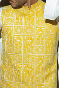 yellow cotton embroidered sleeveless waistcoat with embroidered band & hidden placket