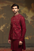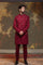 Maroon color self silk jamawar waistcoat Beautifully finished with zardozi and resham work on neckline and all over zardozi spray, Paired with maroon color self silk jamawar kurta and pant