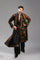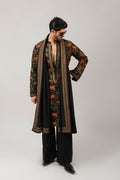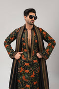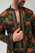 Black kurta with overall tiger embroidery with straight cotton pants finished with silk shamoz ban, boarder at the sleeves paired with patka which has embroidered board and finished with cotton binding.
