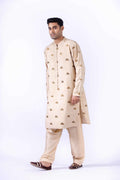 Antique fish shape Embroidered silk cotton oversized kurta with handmade custom buttons paired with Korean raw silk shalwar.