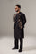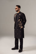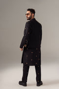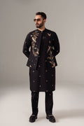Black kurta in cotton with embroidered spray paired with matching pants, open Waistcoat which has full embroidery on the front in same color family.