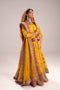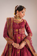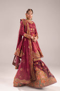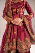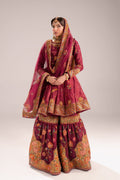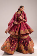 This four-piece traditional outfit is a rich deep berry or wine-colored fabric. The style is a modern iteration of a gharara suit.The ensemble features a short, flaired peplum with a fitted bodice and bolero on top with matching dupputa. Main fabric is net but lined with tissue to increase it grandeur Both the peplum and the voluminous gharara are heavily adorned hemline and the gharara's tiers are intricately decorated with wide borders of detailed incorporating touches of teal, orange, and green embroidery.The overall aesthetic is opulent and traditional, suitable for formal celebration like a wedding or shaadi.