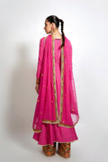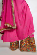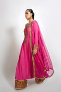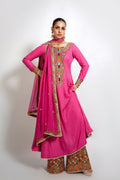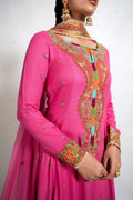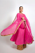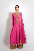 A graceful pink dobby lawn a-line with full sleeves, delicate scattered embroidery, and a beautifully detailed neckline. Paired with wide-legged embroidered trousers and a matching chiffon dupatta finished with an elegant border, this vibrant ensemble is perfect for festive occasions and celebrations.