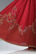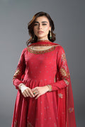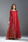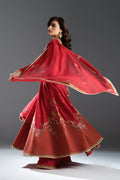A classic red Anarkali adorned with intricate detailing and embellishments, paired with a matching dupatta and wide-leg pants.