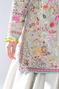 Description: A timeless tale of heritage and elegance, woven into every thread. Inspired by the beauty of our rich culture, “Nastaleeq” is meticulously designed in mesmerizing grey colour, with an intricately embellished, short raw silk shirt and a stunning raw silk lehnga that boasts a bold border. This exquisite bridal is paired with a regal net dupatta and an exquisite pouch. Includes: Short shirt ( Fabric : Raw silk ) Lehenga ( Fabric : Raw silk ) Dupatta ( Fabric : Net ) Pouch ( Fabric : Raw silk ) Delivery Time: 3 Months Note: Custom size