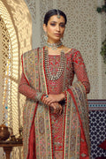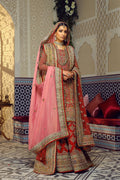 A traditional, heavily embellished red bridal comprising of a sharara, a shirt with intricate details and hand embroidery paired with pink and red kundan zari dupattas finished with signature in house finishes.