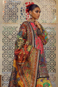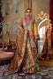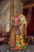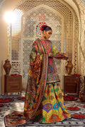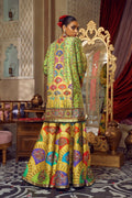 An alluringly printed silk shirt, gharara and tissue dupatta adorned with intricate, colorful embellishments and signature in house finishes