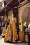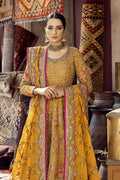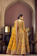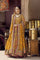 A mustard colored heavily embellished peshwas with zardozi and partial machine embroidery with intricate detailing throughout paired with a complementing embellished dupatta and a sharara with an embellished border.