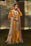 A heavily embellished formal mustard shirt paired with jamawar sharara and mustard mukesh organza dupatta with four side appliqued zardozi and resham work borders finished with finest kiran. Beautifully finished shirt with eye catching zardozi and resham work.