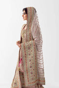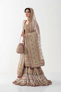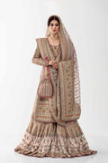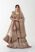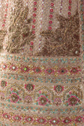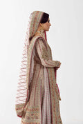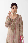 Our graceful ice pink 'Sila Dai' is a set of ready-to-wear heavily embellished Long shirt with embroidered borders of sitara and crystals adorned on the hand and machine work. It is paired with a fancy sharara and a net dupatta giving it a signature Fahad Hussayn festive look.